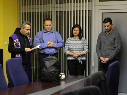 El padre Václavek bendice unas oficinas (en este caso, de unos políticos locales eslovacos)
