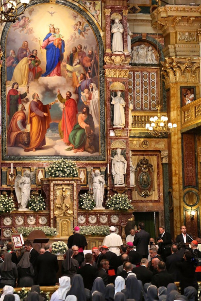 María Auxiliadora, cuando pintado en 1865 por Tomás Andrés Lorenzone a petición de Don Bosco. Se encuentra en la basílica de María Auxiliadora de Turín, en la foto visitada el 21 de junio de 2015 por el Papa Francisco.
