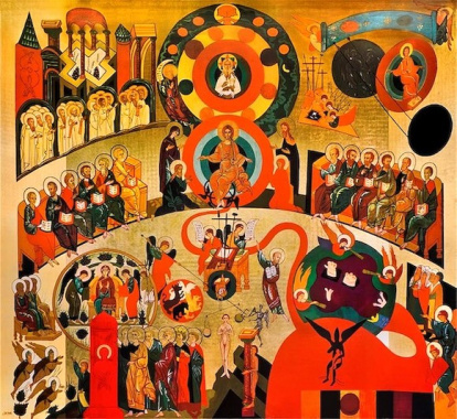 Esas personas viven, porque Cristo ha vencido la muerte, y porque para Dios todos viven. ¡Han vencido en Cristo! ¡Son CAMPEONAS con Él! ¡Ya han llegado a la meta! No me extrañaría que éste sea un detalle original del autor, y que no exista en ningún otro icono que represente esta escena. Los abortos, incluidas las científicas abortadas, estarán presentes cuando aquellos que los han perpetrado sean juzgados. Muy probablemente pedirán misericordia para ellos porque no sabían lo que hacían. Como están vivos, se les puede pedir perdón antes del juicio final, porque son capaces de escuchar.