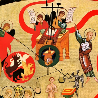 En el centro de la imagen, justo debajo de Jesucristo, está la escena del Juicio Final personal por el que cada uno pasaremos, donde una mano sujeta la balanza, que Satanás con nuestros pecados querrá que se decante en favor suyo para nuestra condena. Dentro de esa mano hay figuras humanas: el autor explicó en 2005 en Amsterdam: "Entonces, debajo de ese trono, donde están los Evangelios, hay una mano. Una mano y una vasija donde están todas las lágrimas del sufrimiento del mundo. Dios ha recogido las lágrimas…esto está revelado. El sufrimiento humano no es estúpido. No es inútil. Después de la mano hay pequeñas figuras que son los abortos".