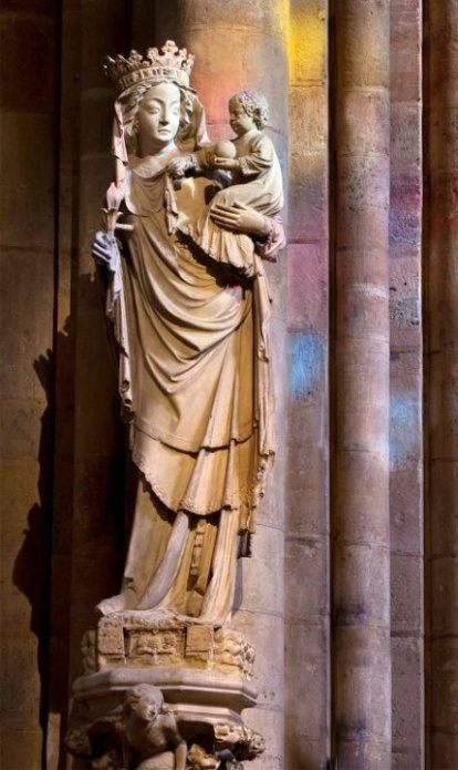 Se ha salvado, junto con la gran cruz dorada del presbiterio. Unos la llaman la Virgen de la sonrisa, otros la Virgen del pilar derecho, y algunos ven en ella la genuina representación de Notre Dame de París, pues es la imagen mariana más conocida del templo. En ese mismo pilar había otra imagen de la Virgen, destruida por los revolucionarios en 1793, pero sería en 1855 cuando esta talla gótica fue instalada en su emplazamiento actual, cerca de la sacristía.