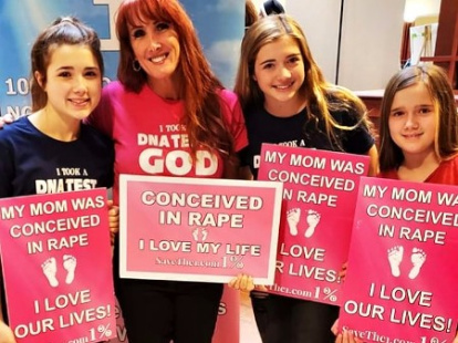 El post que se hizo viral, gracias a los defensores del aborto, es una foto mía con mis tres hijas, sosteniendo nuestros carteles rosados de Save The 1: "Concebido en una violación. Amo mi vida" y "Mi mamá fue concebida en violación. Amo nuestras vidas”. Muchos acusaron a mis hijas de “celebrar la violación de la abuela”. Insultaron a mis hijas. Notaron que mi madre no está en la foto y sugirieron que ella, la víctima de violación, no debe "amar su vida". Me llamaron 'la niña de póster' por la que debes abortar. Y eso es lamentable. Y todo esto porque tengo la audacia de valorar realmente mi vida.