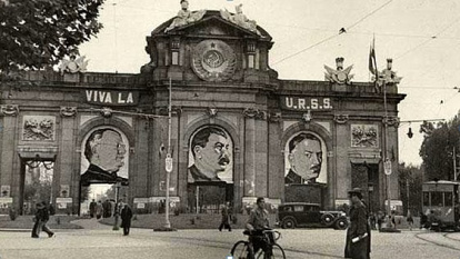 La Puerta de Alcalá, emblemático monumento madrileño, convertida en homenaje permanente a la Unión Soviética bajo el régimen del Frente Popular durante la guerra civil. De izquierda a derecha, Maxim Litvinov, ministro de Asuntos Exteriores de la URSS; José Vissariónovich Dzhugashvili, alias Stalin; Kliment Voroshilov, ministro de Defensa.