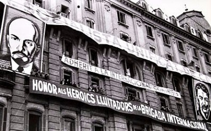 Barcelona, durante la guerra civil: carteles de Vladimir Ilich Ulianov, alias Lenin, y José Vissariónovich Dzhugashvili, alias Stalin, en la sede del PSUC, junto a una pancarta de homenaje a las Brigadas Internacionales.