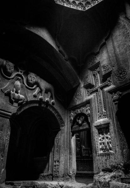 A poco más de treinta kilómetros al este de Ereván se encuentra el monasterio de Geghard. Excavado en la montaña y rodeado por imponentes acantilados, fue incluido por la Unesco en la lista del Patrimonio de la Humanidad. El complejo, y la capilla principal, construida en el 1215, fue fundado en el siglo IV por Gregorio "el iluminador", sobre un manantial sagrado que hay en el interior de una cueva. Atravesamos recovecos, mientras los claroscuros de las capillas nos dan la sensación de estar en plena Edad Media. Sin duda, para mí, uno de los lugares más evocadores de cuantos tiene Armenia.