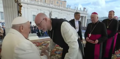 Octavi Vilà Mayo, cisterciense y nuevo obispo para Gerona, saluda al Papa Francisco tras la catequesis del miércoles.