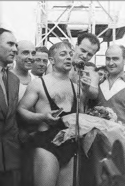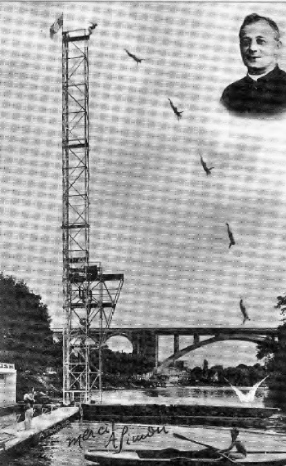 Esquema que muestra una de sus hazañas. Así que se preparó a conciencia, y en agosto de 1947 realizó el primer salto. Fue desde una torre de madera sobre una roca de veinte metros sobre las frescas aguas del lago Villers. Cuando se vio arriba, se encomendó a su santa favorita, la joven de Lisieux: "Santa Teresita, ayúdame, ahora ya no hay marcha atrás". Y no la hubo. Se lanzó y logró su objetivo recaudador, pero a base de pasarse ocho días en cama del planchazo que se pegó. Pero el padre Simon no se arredraba ante las dificultades, y desde ese día y durante los siguientes tres lustros, desde alturas que oscilaron entre los 35 y los 42 metros (trece o quince pisos), en aguas del Sena en invierno o en los puertos de Marsella o Casablanca, completó ciento diez saltos. Como cuenta Serge Pautot, gracias a ellos consiguió arreglar su iglesia, aliviar la miseria de sus feligreses, llevar de vacaciones al mar a los niños de la parroquia y crear una colonia de vacaciones por la que pasaron a lo largo de doce años seiscientas familias.