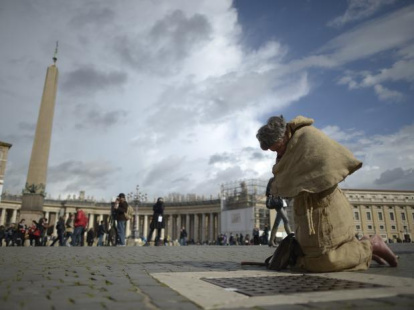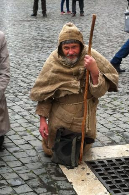 Se llama Massimo Coppo, es italiano, tiene 64 años. Vestía un hábito franciscano de yute, llevaba bastón, un bolso al hombro, y en la Plaza de San Pedro rezaba descalzo y de rodillas bajo la lluvia y el frío.