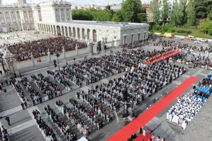 Sábado previo a Pentecostés en Madrid: en la explanada ante la catedral de la Almudena, desafiando un frío insólito a estas alturas de mayo, 1.138 jóvenes y otros tantos padrinos, además de sus parientes y amigos, escuchaban la predicación del cardenal Rouco, que les impartió el sacramento de la Confirmación y les pidió que que transmitan la fe en su entorno, en "esta hora tan dolorosamente crítica de la historia".