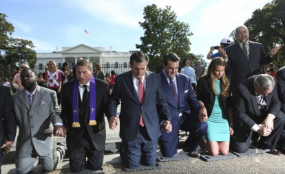 Ted Cruz (en el centro con corbata roja) en septiembre de 2013, ante la Casa Blanca, en una oración junto a un grupo de pastores y activistas de la Christian Defense Coalition pidiendo la liberación del pastor cristiano Saeed Abedini, que cumpía un año de cárcel en Irán