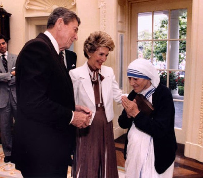 Con Diana de Gales y Ronald y Nancy Reagan: la Madre Teresa nunca rechazó ningún contacto que pudiese servir a los pobres a quienes atendía su congregación.