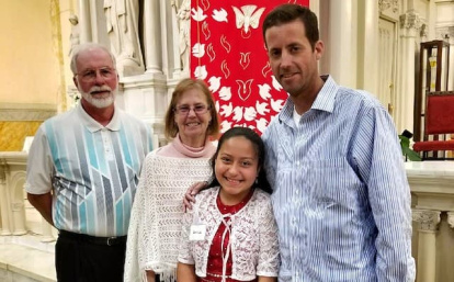 Scott, con sus padres y con Neveah en la confirmación de la pequeña. Foto: National Catholic Register.