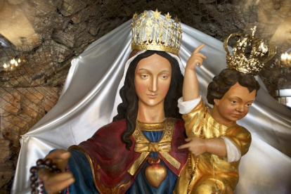 Arriba, imagen de Nuestra Señora de la Montaña, en Anjara. Abajo, misa en el santuario de Nuestra Señora de la Montaña.