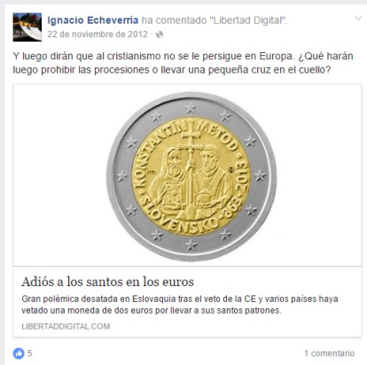 Ignacio Echeverría usaba poco su cuenta de Facebook, y casi siempre para poner fotos o vídeos de skating y monopatín. La excepción fue un mensaje de denuncia en 2012 cuando la Unión Europea presionó a Eslovaquia para que retirara sus monedas de dos euros con la cruz eslava de su bandera y la imagen de San Cirilo y San Metodio (patronos de Europa y creadores del alfabeto cirílico).