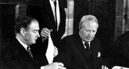 Liam Crosgrave (izquierda) firma con el primer ministro británico Edward Heath (derecha) los Acuerdos de Sunningdale, el 9 de diciembre de 1973.