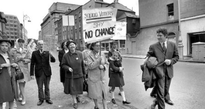 Manifestantes contra la importación de anticonceptivos en julio de 1974. (Foto: Irish Times.) La ley que la habría permitido fue derrotada ese mes por 75 votos contra 61. Crosgrave y otros seis diputados del Fine Gael votaron contra la posición de su partido. De haberlo hecho a favor, la ley habría salido adelante por un voto: el de Crosgrave, primer ministro del Fine Gael, fue, pues, decisivo.