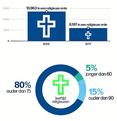 Pero aún es más indicativa la distribución de edades: el 15% son mayores de 90 años, el 80% tienen entre 75 y 90 años, y solo el 5% menos de 60 años. En 2017 hubo en todo Flandes 3 novicios y 5 votos temporales. Solo a lo largo de 2018 se espera que la caída sea de mil consagrados, es decir, en torno a un 16%. Es una Iglesia abocada a la extinción de facto en el plazo de un lustro.