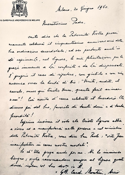 Tres años antes, el 20 de junio de 1960, el entonces arzobispo de Milán había enviado una cariñosa carta al Padre Pío cuya copia manuscrita de gran valor histórico exhumó hace ya casi cincuenta años su hijo espiritual Francisco Sánchez-Ventura, pero que ha pasado casi inadvertida hasta hoy. La epístola, junto a otros documentos desconocidos, ha formado parte de las investigaciones de José María Zavala en los archivos de San Giovanni Rotondo para escribir El Santo.