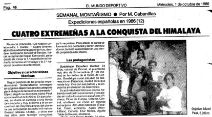 Ahora escala otras cumbres, pues Guadalupe fue una experimentada montañera y una pionera en el mundo de la montaña. El rotativo Mundo Deportivo le dedicó una página entera el miércoles 1 de octubre de 1986 para contar todos los detalles de la expedición que iba a iniciar junto a tres amigas más al Island Peak, de 6.200 metros de altura. “Cuatro extremeñas a la conquista del Himalaya”, titulaba el periodista.