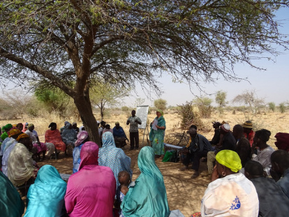 Lola, de pie de verde y con el pelo tapado, imparte una clase de agricultura y nutrición en Níger, país semidesértico y musulmán al 99%