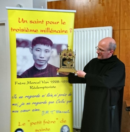 El actual postulador de la causa de beatificación de Marcelo Van es el monje benedictino Olivier de Roulhac, quien en la foto muestra una reliquia de Santa Teresita del Niño Jesús, tan unida al joven religioso. En el cartel puede leerse una frase característica del hermano Van: "No miro ni lejos ni cerca de mí, solo miro a Aquel que mi corazón ama".