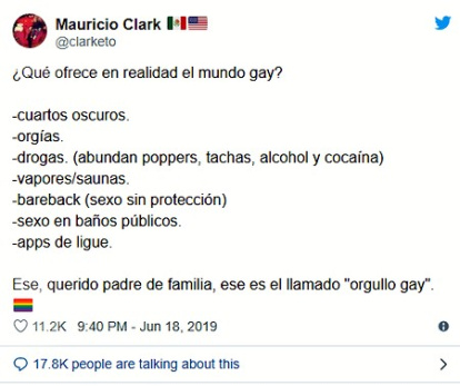 Al acercarse las celebraciones del denominado Orgullo Gay, testimonios como el de Mauricio Clark, un célebre ex presentador de la cadena mexicana Televisa que abandonó la vida homosexual, desatan las iras de los lobbys LGBT. En las últimas fechas se ha puesto en marcha una campaña para censurar su acceso a redes sociales acusándole de "discurso de odio" a raíz de un tuit donde recogía su experiencia personal: