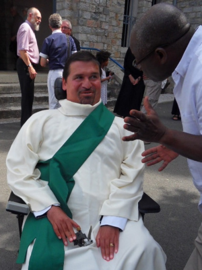 Pero al igual que le ocurrió en el ámbito laboral tampoco lo tuvo fácil en el eclesial. En aquel momento era el diácono permanente más joven de Francia, pero sobre todo era tetrapléjico. Hubo mucho debate en la comunidad católica local. “Cuando fui ordenado surgieron preguntas: ‘¿Cómo lo va a hacer? No tiene brazos ni piernas, no puede coger al bebé para el bautismo…’. Algunos padres se negaron a que bautizara a su bebé pensando que las acciones que no puedo realizar harían disminuir el sacramento. Fue muy doloroso para mí. Mi obispo intervino escribiendo una carta en la que decía que mi esposa, en nombre del sacramento del matrimonio, sería mis manos. Y es lo que ella hace. Es muy bonito”, contaba a la web de la Diócesis de Angulema.