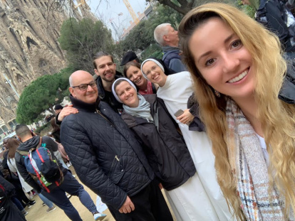 Michelle, con peregrinos de Glasgow ante la Sagrada Familia, camino del LifeTeen 2020