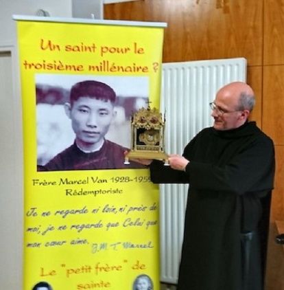 El benedictino Olivier de Roulhac es el actual postulador de la causa de beatificación de Marcelo Van, que comenzó el cardenal François-Xavier Nguyen Van Thuan. En la foto, sostiene una reliquia de Santa Teresita del Niño Jesús junto a un retrato del joven redentorista confesor de la Fe.
