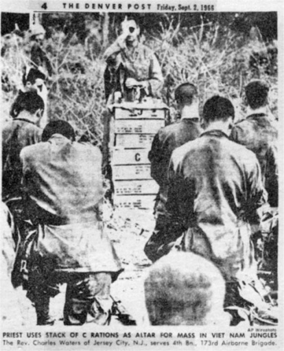 Recorte de un periódico en el que aparece Watters oficiando misa en el frente