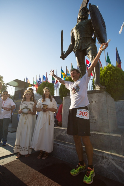 András Löw, en Corinto, celebrando su título como el corredor que más ha participado en la mítica carrera de Espartatlón junto a la estatua de Leónidas.