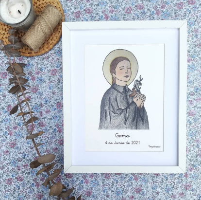 Ilustración de Santa Gema Galgani, uno de los trabajos para bautizos elaborados por Teresa y Pilar desde @trazodemami.