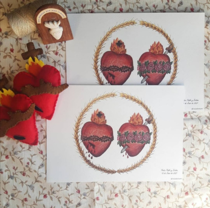 Junto con sus ilustraciones, Teresa y Pilar también difunden la devoción a los Sagrados Corazones mediante representaciones de fieltro desmontables junto con tarjetas e ilustraciones explicativas.