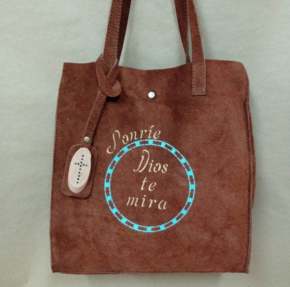 "Sonríe, Dios te mira", una de las inscripciones que HaledS "pinta" de forma artesanal en sus bolsos.