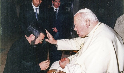 Javier del Río, cuando todavía era sacerdote recibiendo la bendición de Juan Pablo II