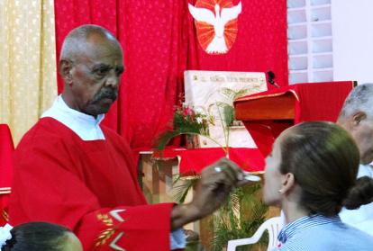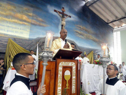 En el micrófono, el diácono Henry Tovar; una función del diácono es proclamar la Palabra.
