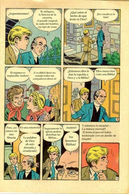 Un clérigo en un país comunista le explica a Andrés el control al que están sometidos los cristianos, sin acceso a biblias y con los jóvenes adoctrinados contra las enseñanzas cristianas. Un cómic adaptó el libro de El Contrabandista de Dios.