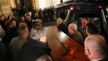 El momento en que familiares y amigos trasladan el féretro a la capilla ardiente, donde se veló el cuerpo de Diego Valencia desde su asesinato en la noche del miércoles hasta su funeral, celebrado este viernes.