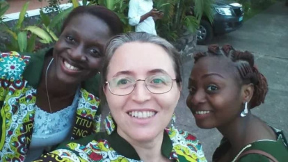 Candelas Varela con alumnas de enfermería en Congo; a la izquierda, Sofía, una voluntaria mexicana