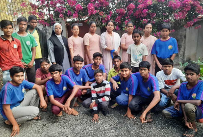 Miembros del convento de las Hijas de Nuestra Señora del Huerto con niños de Navjeevan. Ambika, con la muleta, es la tercera desde la derecha, en la última fila (fotos de Saji Thomas).
