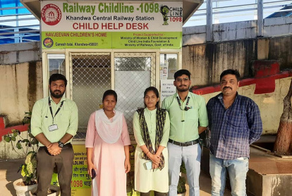 La hermana Indu Toppo (la segunda desde la izquierda) junto a miembros de la oficina de Railway Childline en la estación de tren de Khandwa, donde rescatan a cientos de niños.