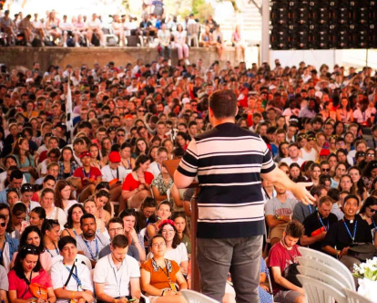 Brenden Thompson -en el centro, con el polo a rayas-, durante una de sus ponencias de evangelización a jóvenes en la JMJ de Lisboa.