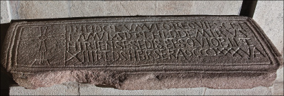 Lápida del sarcófago del obispo Teodomiro de Iria Flavia. La inscripción que figura en ella reza: "En este sepulcro descansa el siervo de Dios Teodomiro, obispo de la sede de Iria, que murió el día 13 de las calendas de noviembre del año 885".