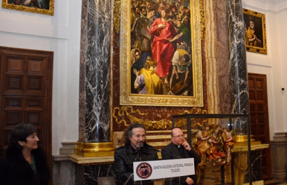 José María Cano, en la catedral de Toledo, presentando su colección de pinturas "Apostolado"