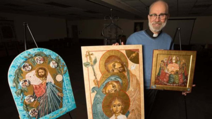 El padre Jim Perkl, con algunos de sus iconos. A la izquierda, el Buen Pastor para la misión de Risen Savior en Filipinas (Catholic Spirit)