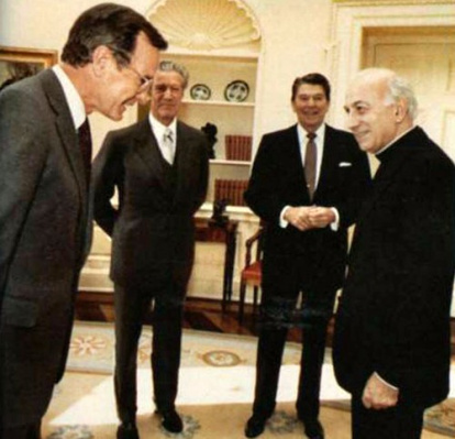 En el Despacho Oval de la Casa Blanca y en presencia de Reagan, el vicepresidente Bush saluda al futuro cardenal Laghi (1922-2009), a la sazón delegado apostólico de la Santa Sede en Estados Unidos.
