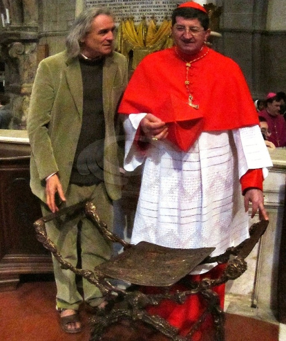 Como corresponde a un arzobispo de Florencia, el cardenal Betori es un protector del arte. Aquí le vemos recibiendo un faldistorio para la catedral obra de Massimo Lippi.
