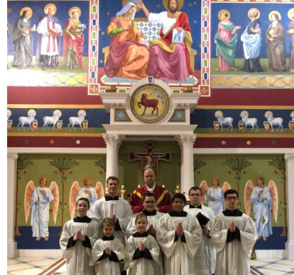 Harrison con su párroco y varios monaguillos de los que coordina durante la Misa