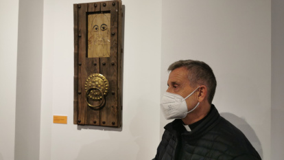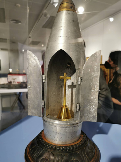 "Hasta los restos de la destrucción pueden ser piezas dirigidas a la contemplación" menciona el capellán en la exposición. En la imagen, un sagrario realizado a partir de una bomba.