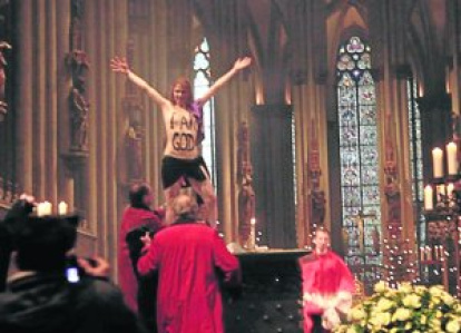 Una tal Josephine (según la cuenta española de Femen en Facebook) irrumpió en plena misa solemne de Navidad en la majestuosa catedral de Colonia (Alemania) y ante la indignación de los feligreses y el cardenal, Joachim Meisner (que además celebraba su 80º cumpleaños) ocupó el altar semidesnuda.